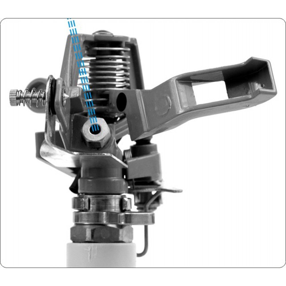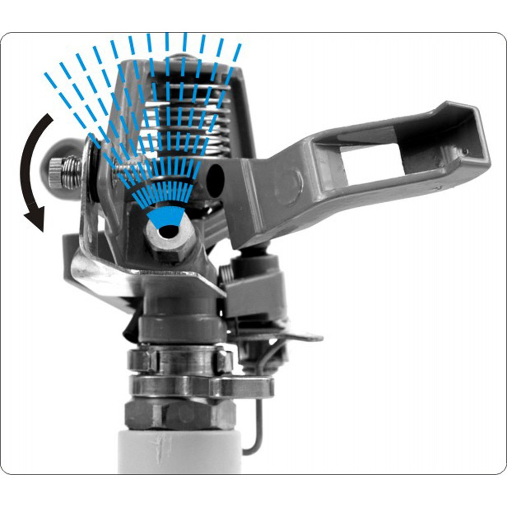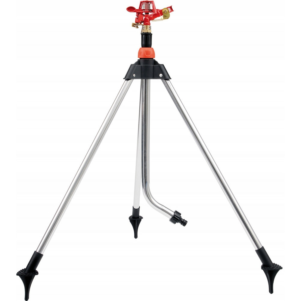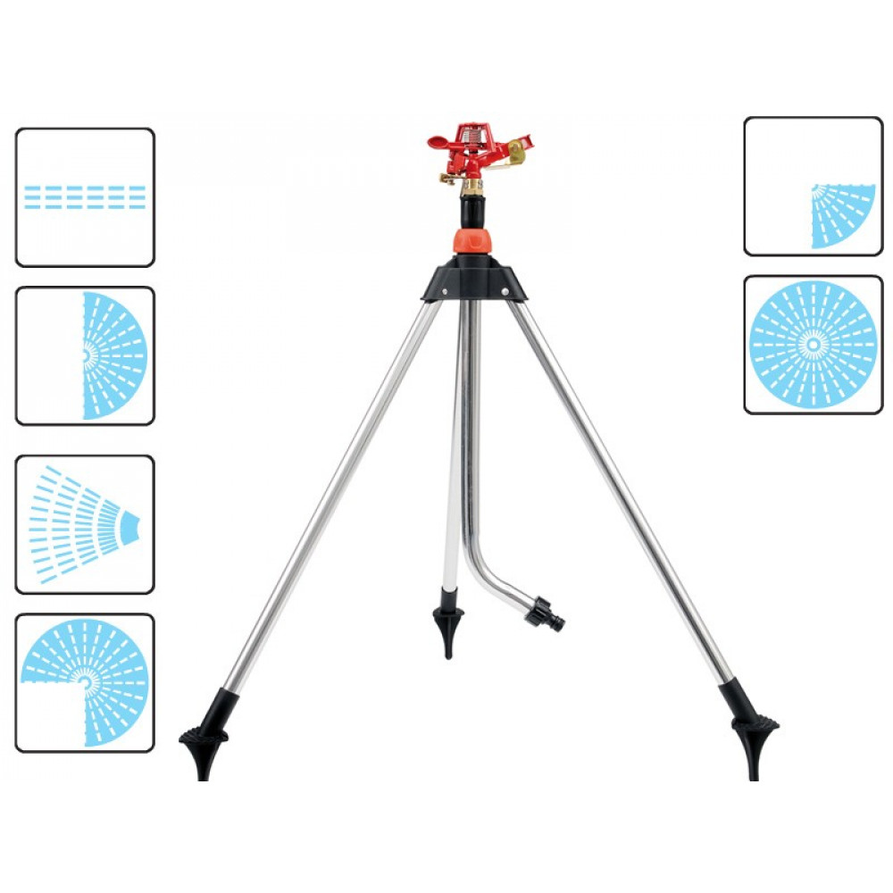 Ротационный импульсный ороситель YT-8984 от YATO. Алюминиевый штатив с элементами ABS, трехногий, обеспечивающий балансировку устройства. Ножки на штативе можно без проблем зафиксировать в земле. Регулировка высоты оросителя от 65 до 93 см. Спринклер работает в диапазоне от 45 до 360 градусов. Он оснащен быстроразъемным соединением и заглушкой. Максимальный диаметр распылительного устройства - 24 м.