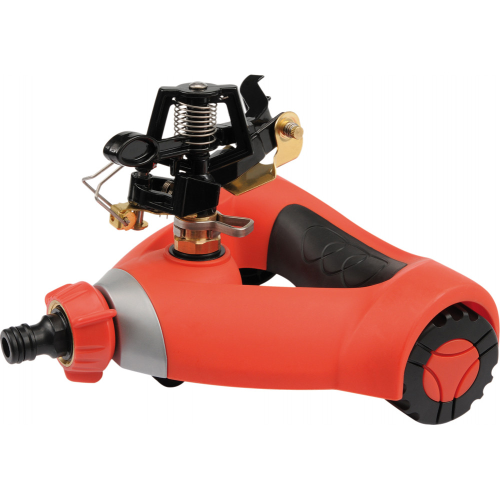 Этот необычный ороситель имеет основание с двумя колесами, изготовленное из пластика ABS и поворотный аппарат с диаметром орошения до 24м. Диапазон можно регулировать от 45 до 360 градусов.