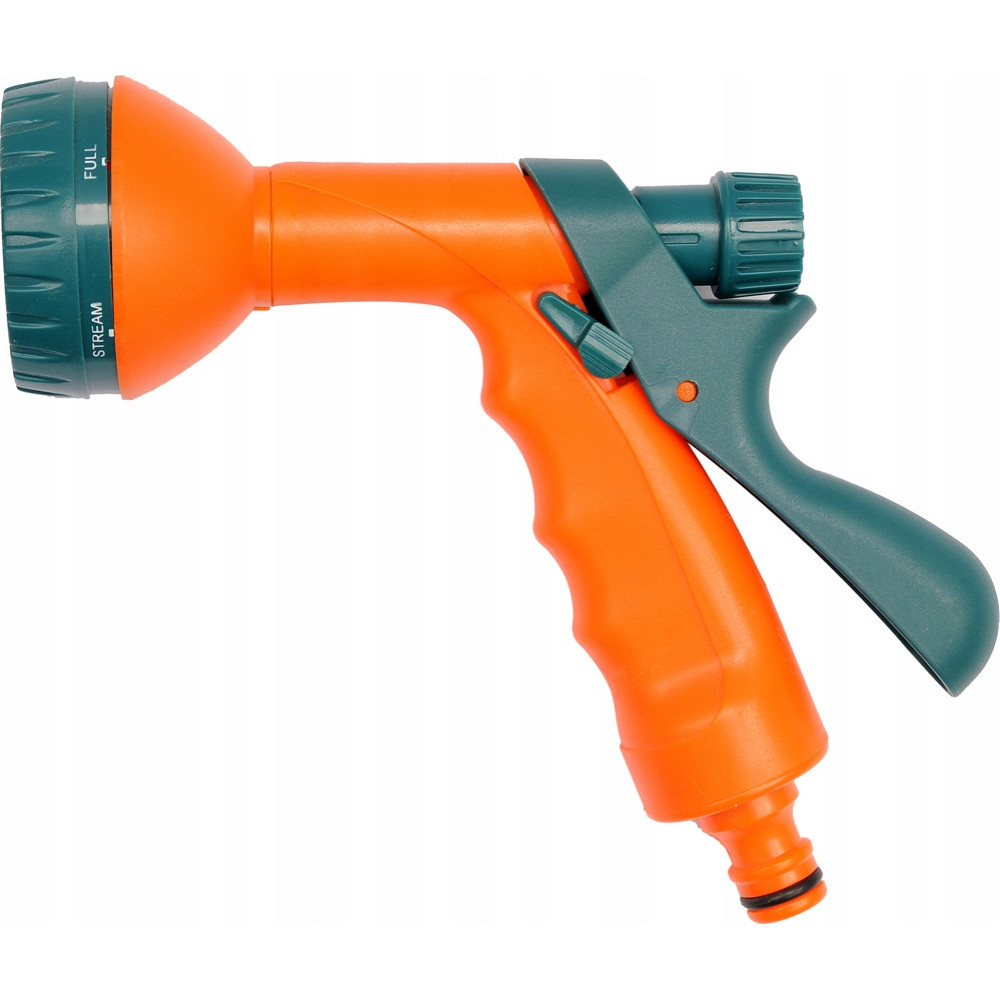Этот пистолет-распылитель приспособлен для работы со шлангами, диаметр которых равен 1/2 дюйма. Размеры приспособления составляют 545х395х350 мм при весе 124 грамма. Пистолет оснащен очень плавной и удобной системой смены режимов полива, а также специальным фиксатором для долгой работы. В комплект помимо пистолета также входят другие приспособления: адаптер, соединитель и специальный наконечник. Все они значительно упрощают весь процесс поливочных работ, давай возможность оперативно соединять разные элементы между собой.