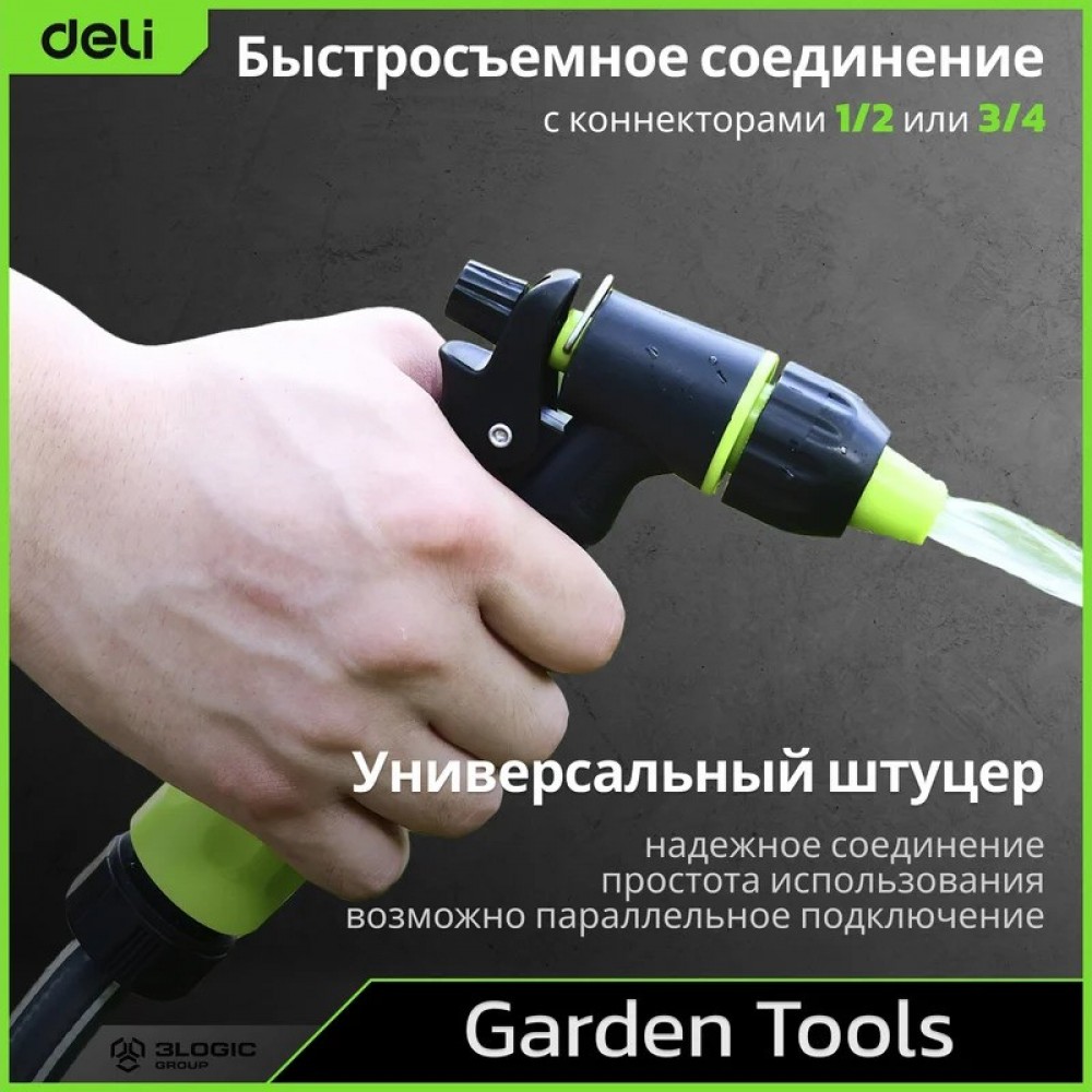 Пистолет-распылитель Deli DL8757 — это практичный инструмент для качественного полива растений. Благодаря продуманной конструкции и трем режимам работы, устройство позволяет эффективно ухаживать за любыми зелеными насаждениями. Наличие фиксатора курка и удобная регулировка напора делают процесс полива максимально комфортным, а прочные материалы гарантируют длительный срок службы.
