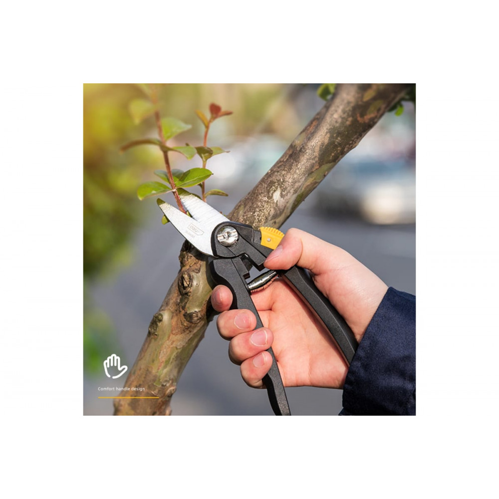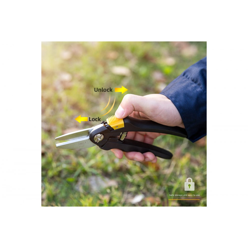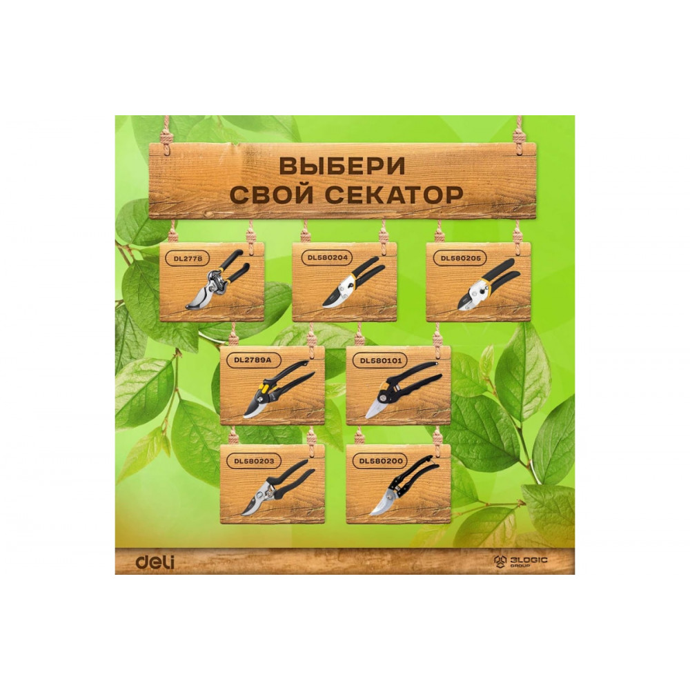 Секатор садовый DL580101, 200мм, Deli обладает функцией блокировки, что позволяет безопасно переносить инструмент и предотвращает случайное открытие лезвий. Кроме того, благодаря полированной поверхности секатора, он легко очищается от загрязнений и сохраняет свой первоначальный вид на протяжении длительного времени.