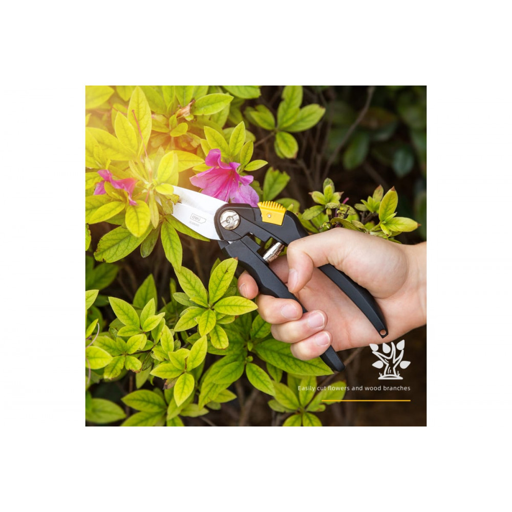 Ручки секатора эргономичной формы обеспечивают удобный и безопасный захват инструмента в руке. Благодаря специальному механизму, обеспечивается плавное и легкое открытие и закрытие лезвий, что снижает нагрузку на руку при работе.
