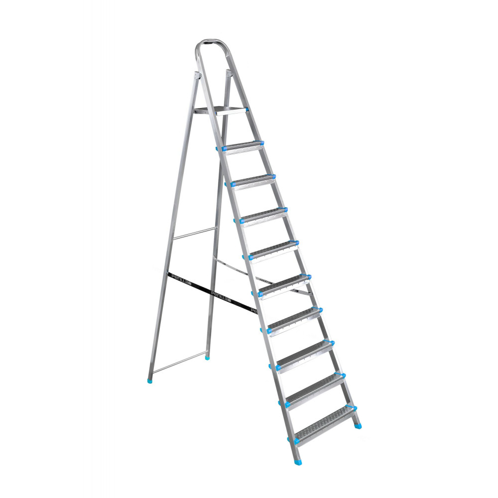 Данная модель лестницы обладает десятью ступенями и односторонним дизайном. Стальной каркас имеет специальное гальваническое покрытие. Все ступени этой стремянки надежно закреплены на двух стойках, а их рельефная поверхность помогает легче и увереннее стоять на них. Кроме того, ступеньки оборудованы особыми накладками из пластика, благодаря которым можно не опасаться серьезных порезов или ушибов. Лестница имеет достаточно широкую и комфортную площадку в своей верхней части, а высокая дуга обеспечивает дополнительную устойчивость и безопасность.