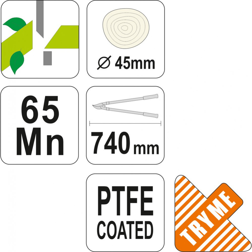 Секаторы для обрезки веток диаметром до 45 мм. Ручки особой формы облегчают работу. Изготовлен из стали, обеспечивает высокую стойкость к истиранию. Общая длина - 74 см, Максимальный диаметр резки - 45 см.