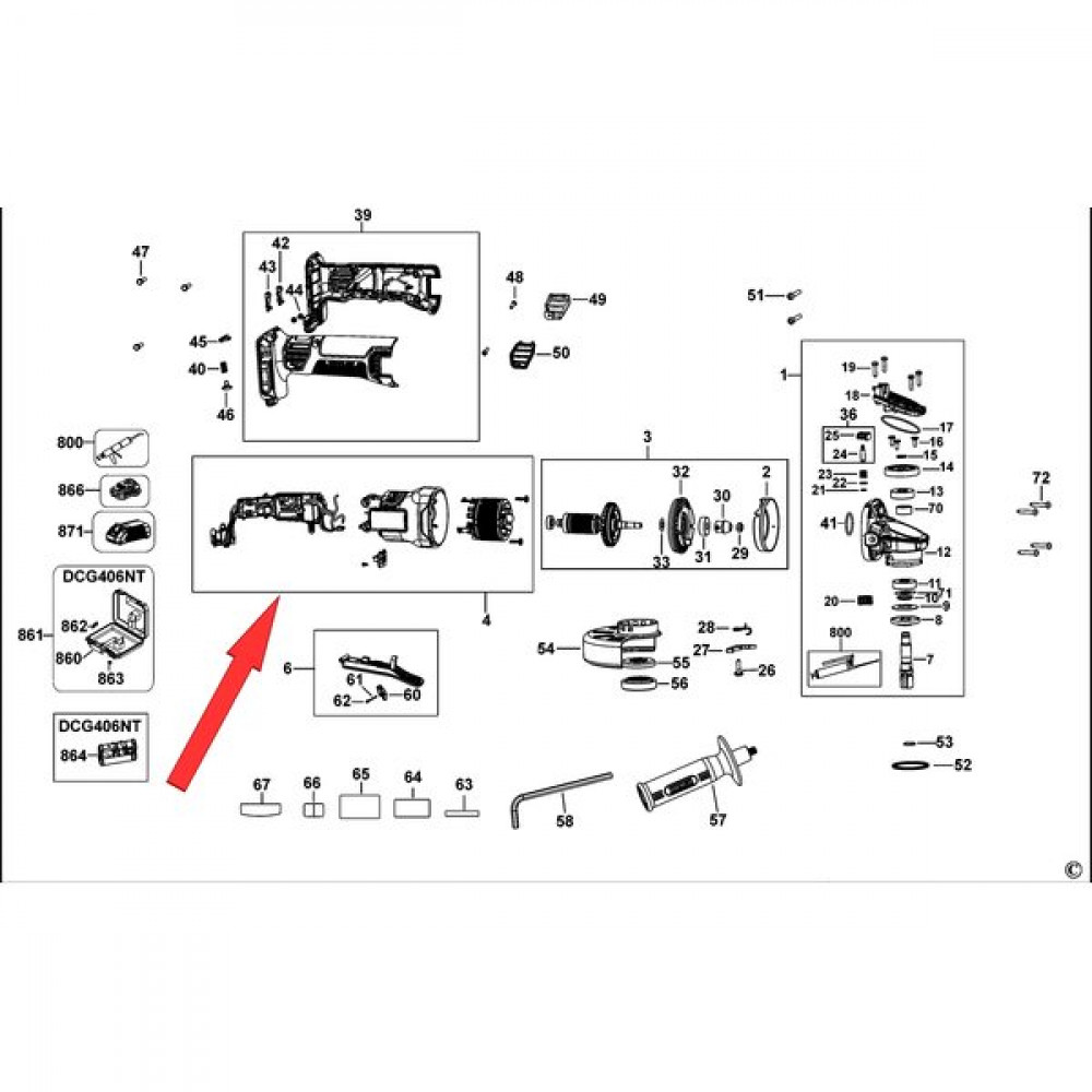 Статор N551802 в сборе с корпусом и выключателем предназначен для использования в болгарке DeWalt DCG406 (тип 1)